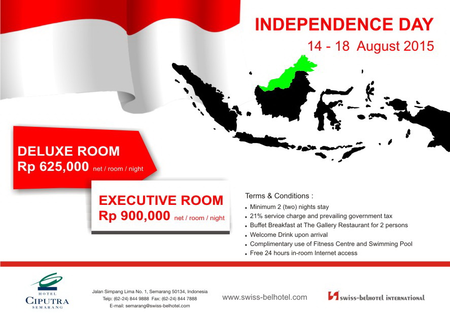 Tidak ketinggalan pula menyambut Hari Kemerdekaan Negara Indonesia, HCS juga menawarkan paket kamar mulai tanggal 14 – 18 Agustus 2015. “Khusus untuk menyambut Hari Kemerdekaan tahun ini, Kami ingin mengajak anda dan keluarga untuk menginap di kamar Deluxe kami dengan harga spesial Rp 625.000,-net/malam dan di kamar Executive di harga Rp 900.000,-net/malam. Harga ini sudah termasuk sarapan pagi, welcome drink, gratis menggunakan fasilitas kebugaran dengan minimum stay selama 2 (dua) malam.” Imbuh Nila Apricya Kolondam selaku Director of Sales HCS.