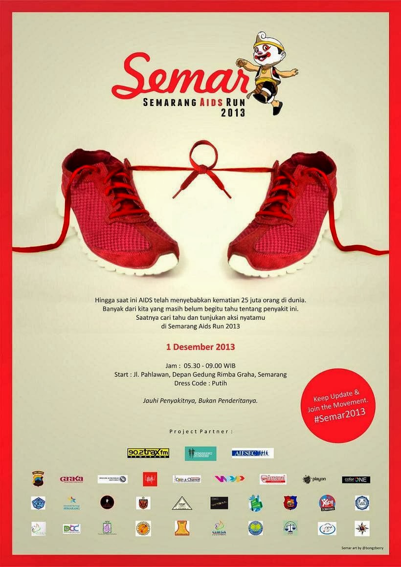 Semarang, 28 November 2013 – Dalam rangka memperingati Hari AIDS Sedunia yang jatuh pada tanggal 1 Desember 2013, Semarang runners Beserta Trax FM dan AIESEC Undip menggagas sebuah gerakan sosial bernama Semarang Aids Run yang mengajak kurang lebih 43 komunitas di Semarang. Acara tersebut akan dilaksanakan jam 05.30 WIB di Area CFD Pahlawan-Simpang Lima. Acara ini digagas karena Semarang merupakan 5 Kota besar yang mengidap HIV dan AIDS terbanyak.