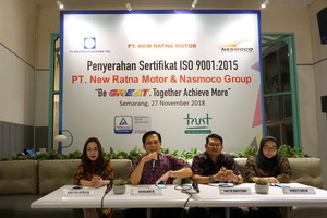 PT New Ratna Motor dan Nasmoco Group sebagai dealer resmi Toyota di wilayah Jawa Tengah dan Yogyakarta, pada Selasa (27/11/2018) malam menerima sertifikat Sistem Manajemen Mutu (ISO 9001:2015) dari badan sertifikasi PT TUV Rheinland Indonesia, badan sertifikasi ini merupakan perwakilan dari Jerman yang mempunyai cabang di Indonesia.