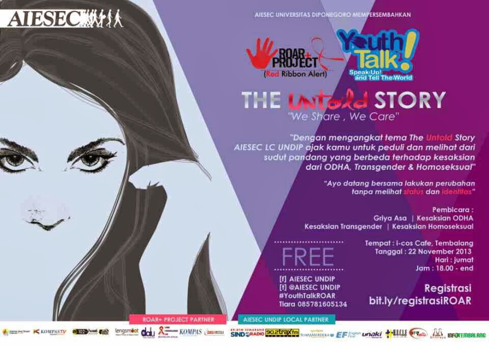 Kegiatan berupa sharing ini akan diselenggarakan pada Jumat, 22/11/13, jam 18.00-selesai. Di I-cos cafe tembalang, GRATIS!!! Dengan tema “The Untold Story” acara ini mengajak semua pesertanya untuk mendengar langsung kesaksian dari penderita AIDS (ODHA). Selain itu hadir juga transgender dan homosekdual yang akan sharing langsung bersama peserta dan juga dari LSM Griya Asa yang menaungi dibidang HIV/AIDS dan pemberdayaan lokalisasi Sunan Kuning.
